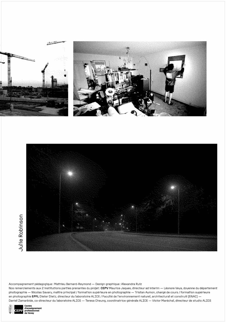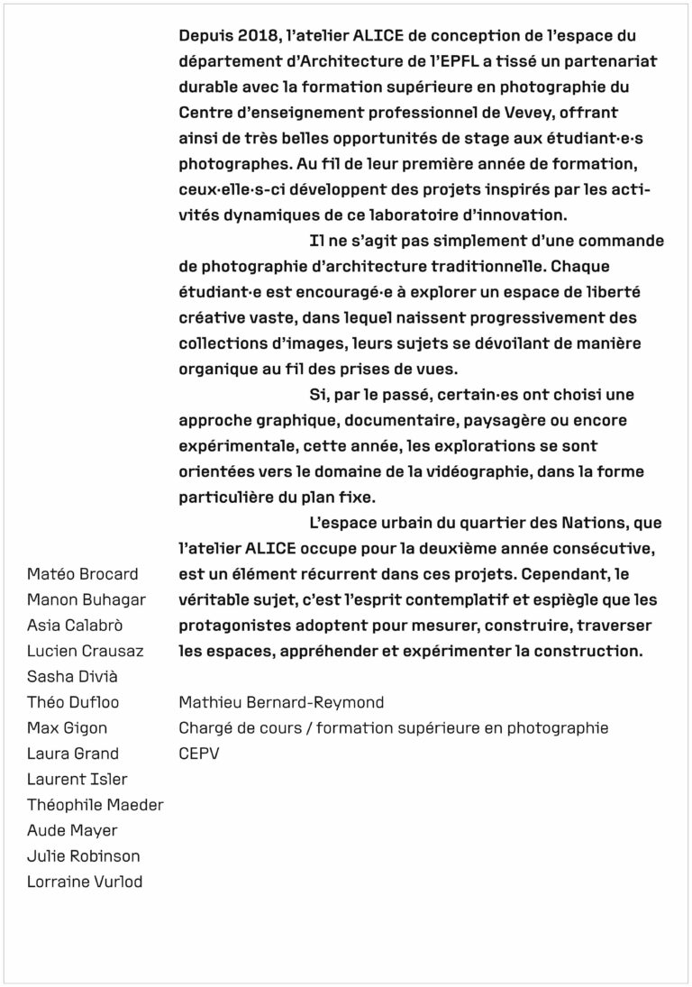 Poursuivant la tradition d’innovation et de collaboration entre l’atelier de la conception de l’espace ALICE de la Faculté de l’environnement naturel, architectural et construit (ENAC) / École polytechnique Fédérale de Lausanne (EPFL) et la formation supérieure en photographie du Centre d’enseignement professionnel de Vevey (CEPV), l’édition 2023 s’écarte légèrement des processus établis les années précédente. Le médium vidéo s’impose, tout en préservant une essence photographique dans le traitement de l’image mouvante, notament par l’utilisation du plan fixe.