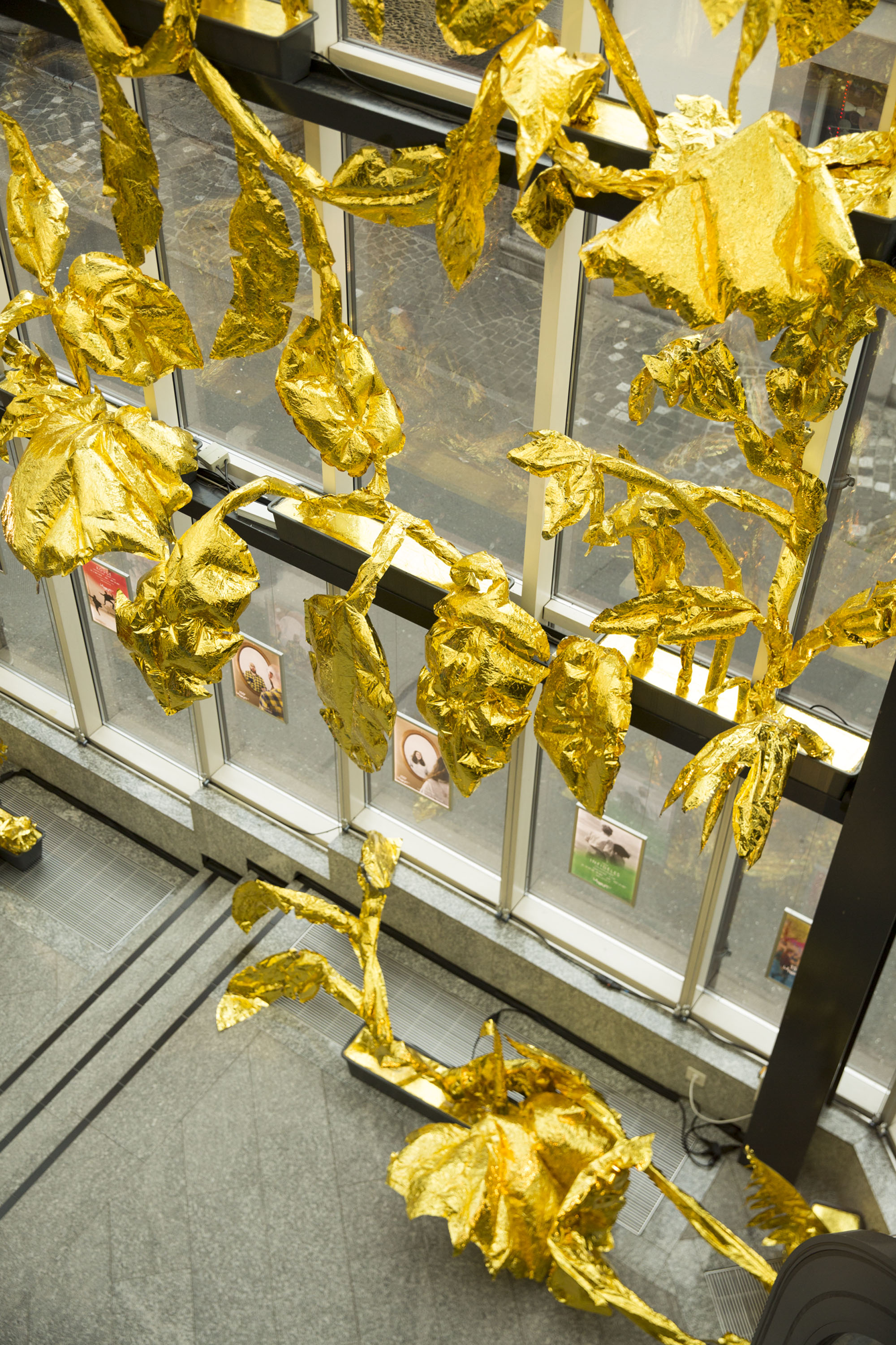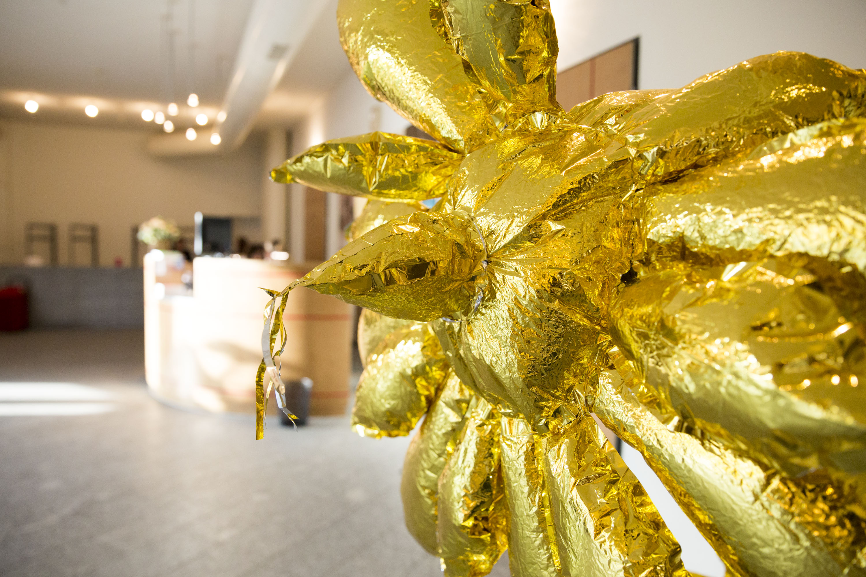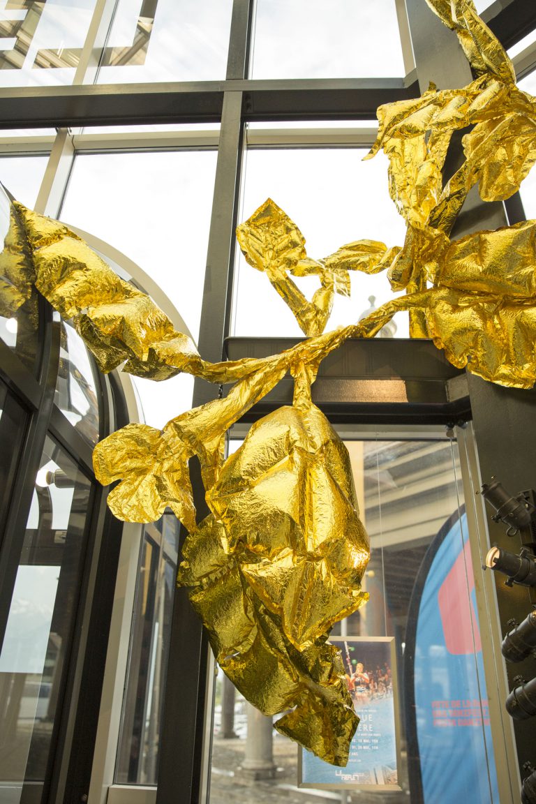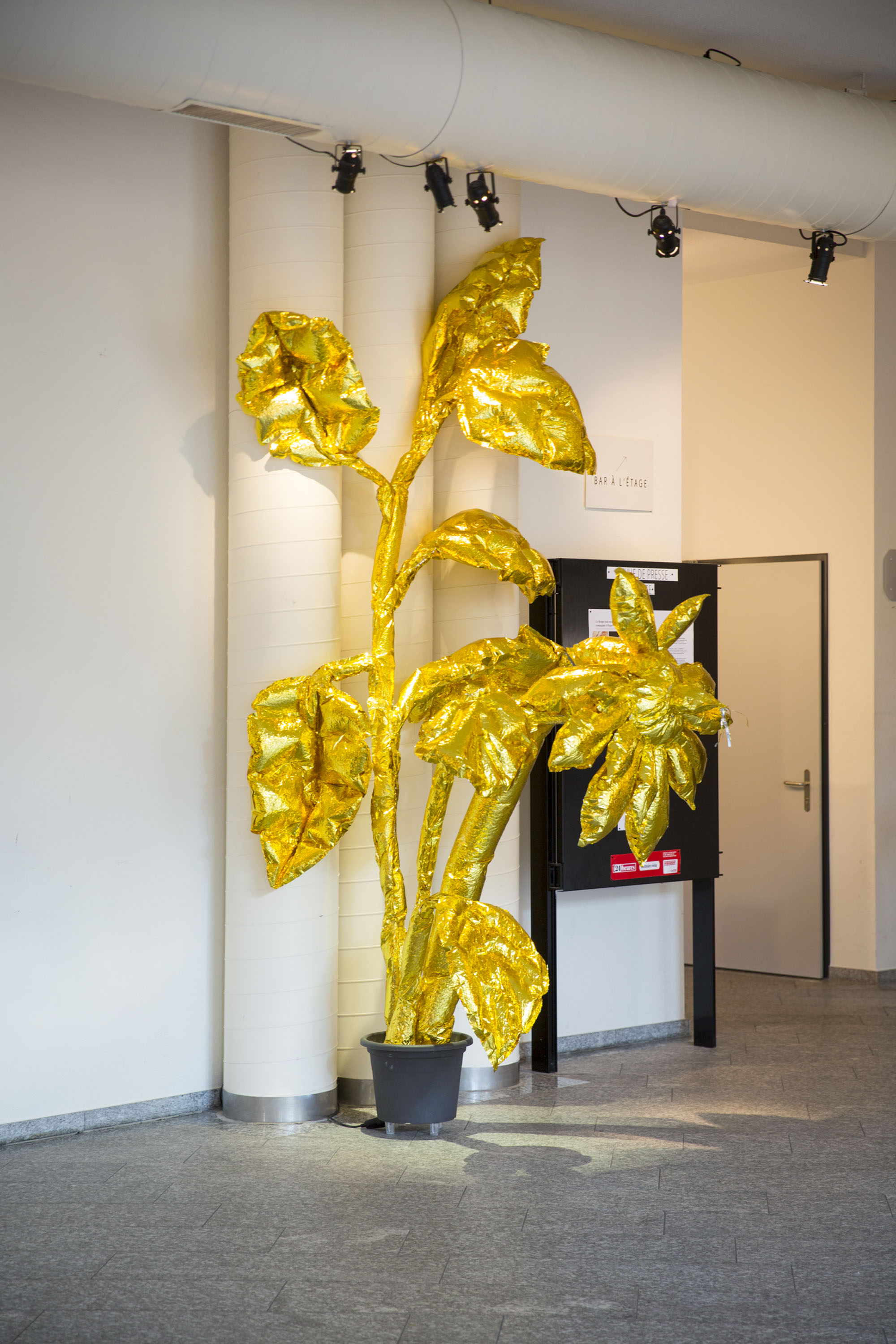 Création du décor pour le Théâtre Le Reflet de Vevey sur le thème végétal et gonflable avec des couvertures de survie dorées.