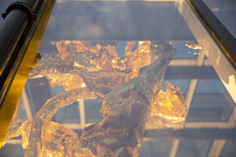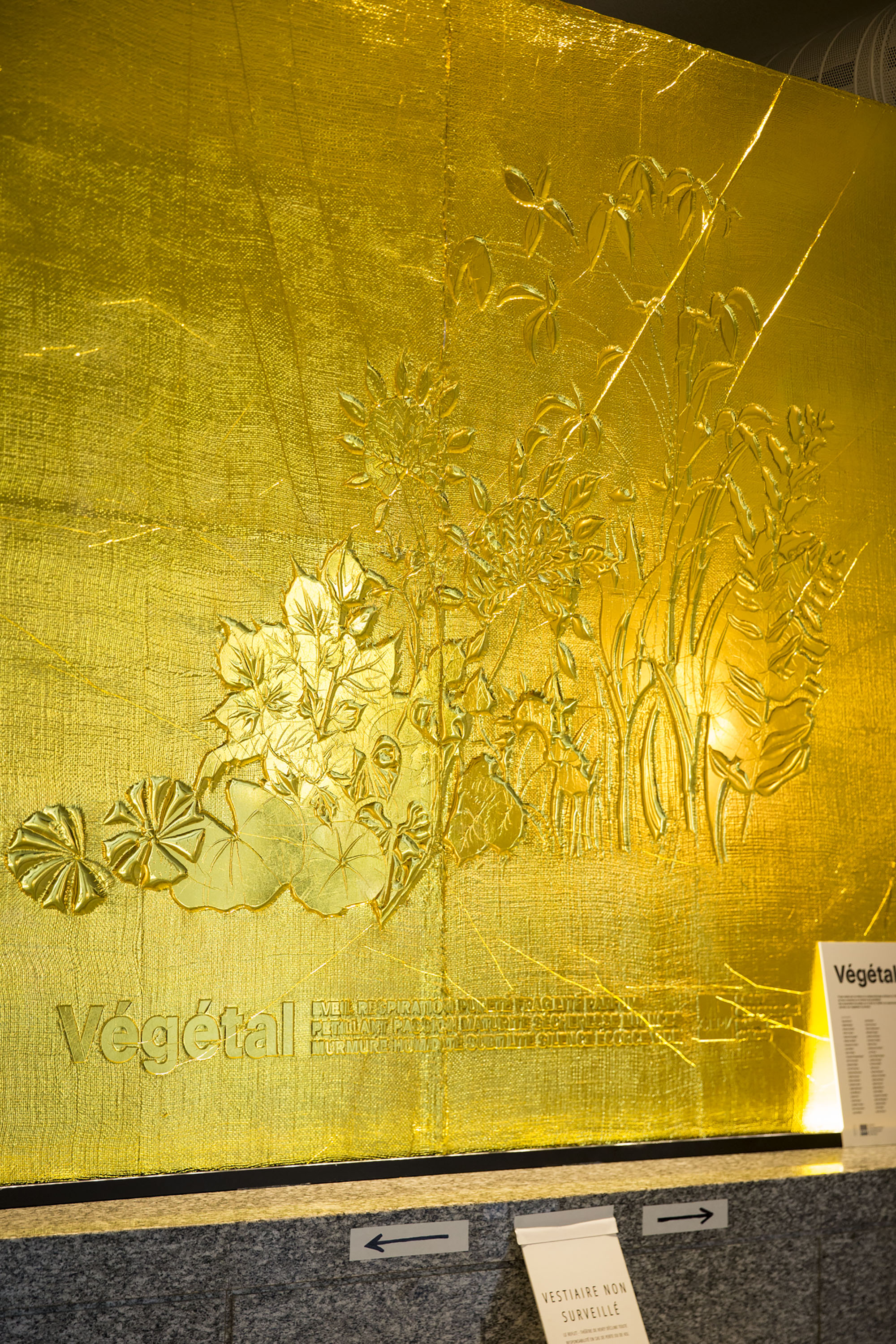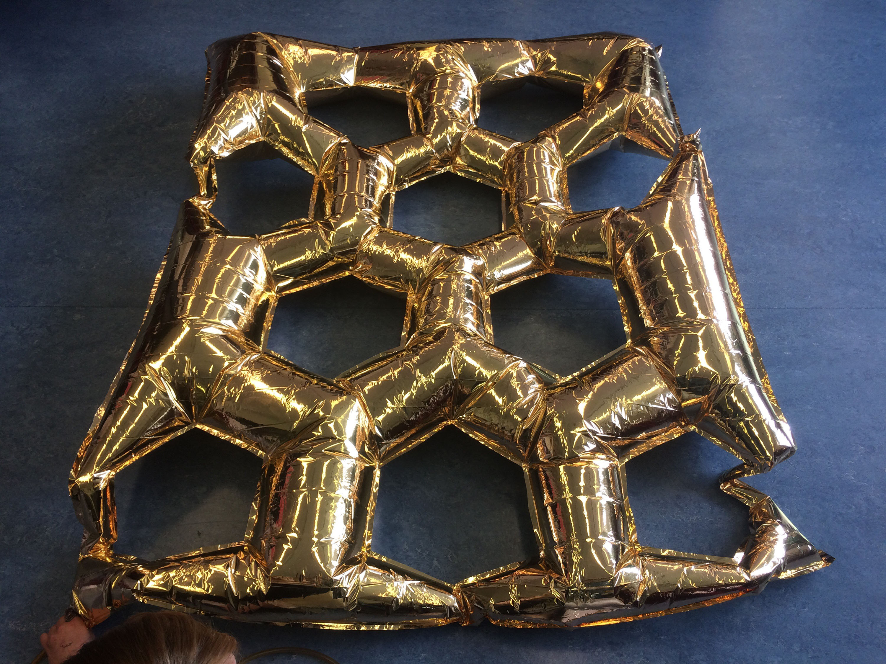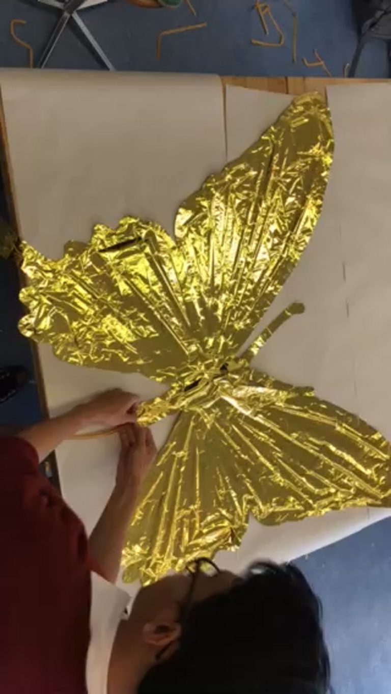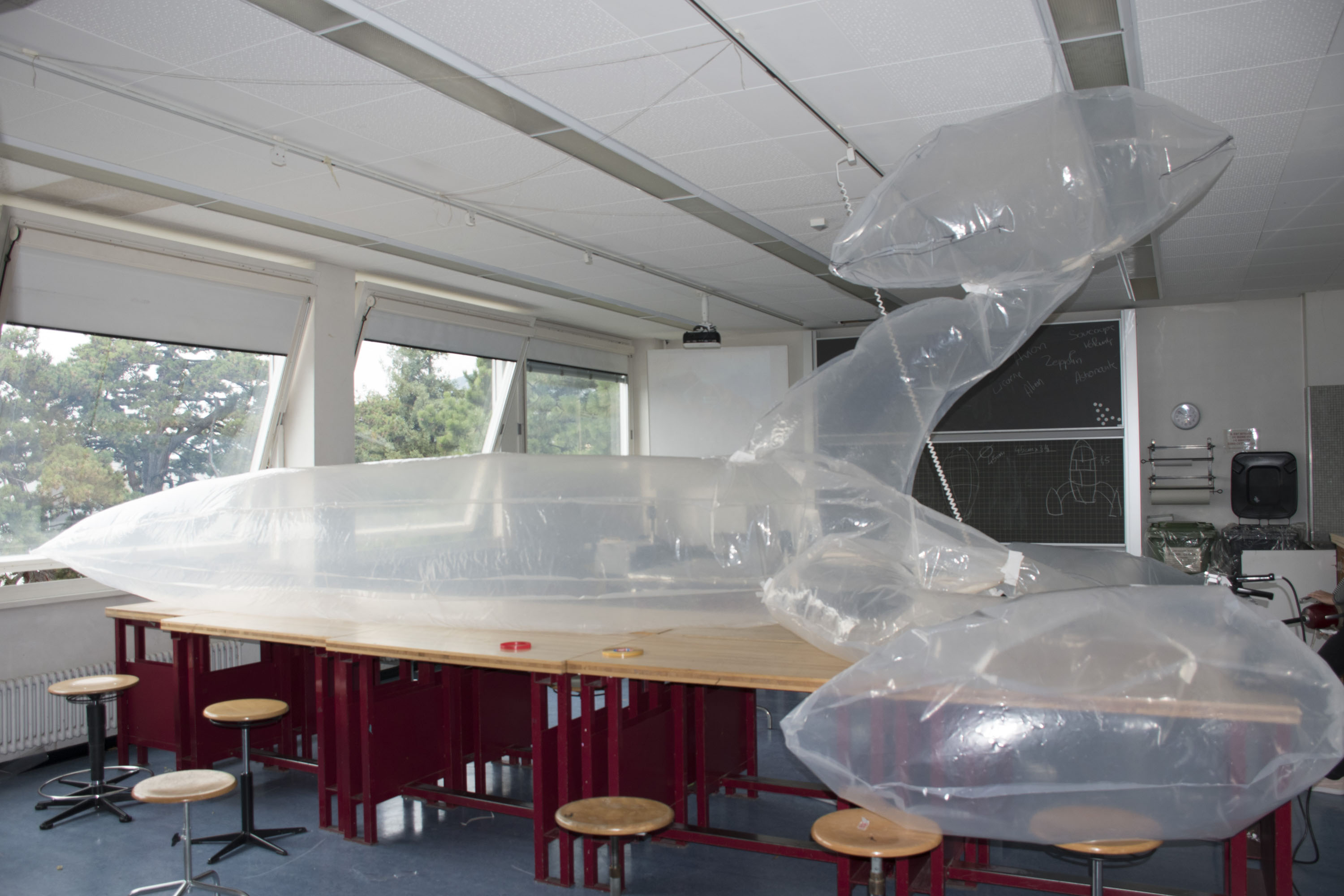 Création du décor pour le Théâtre Le Reflet de Vevey sur le thème végétal et gonflable avec des couvertures de survie dorées.