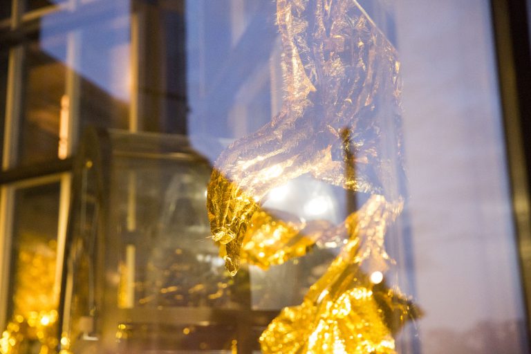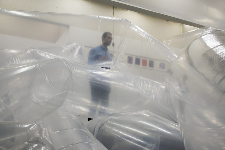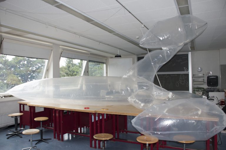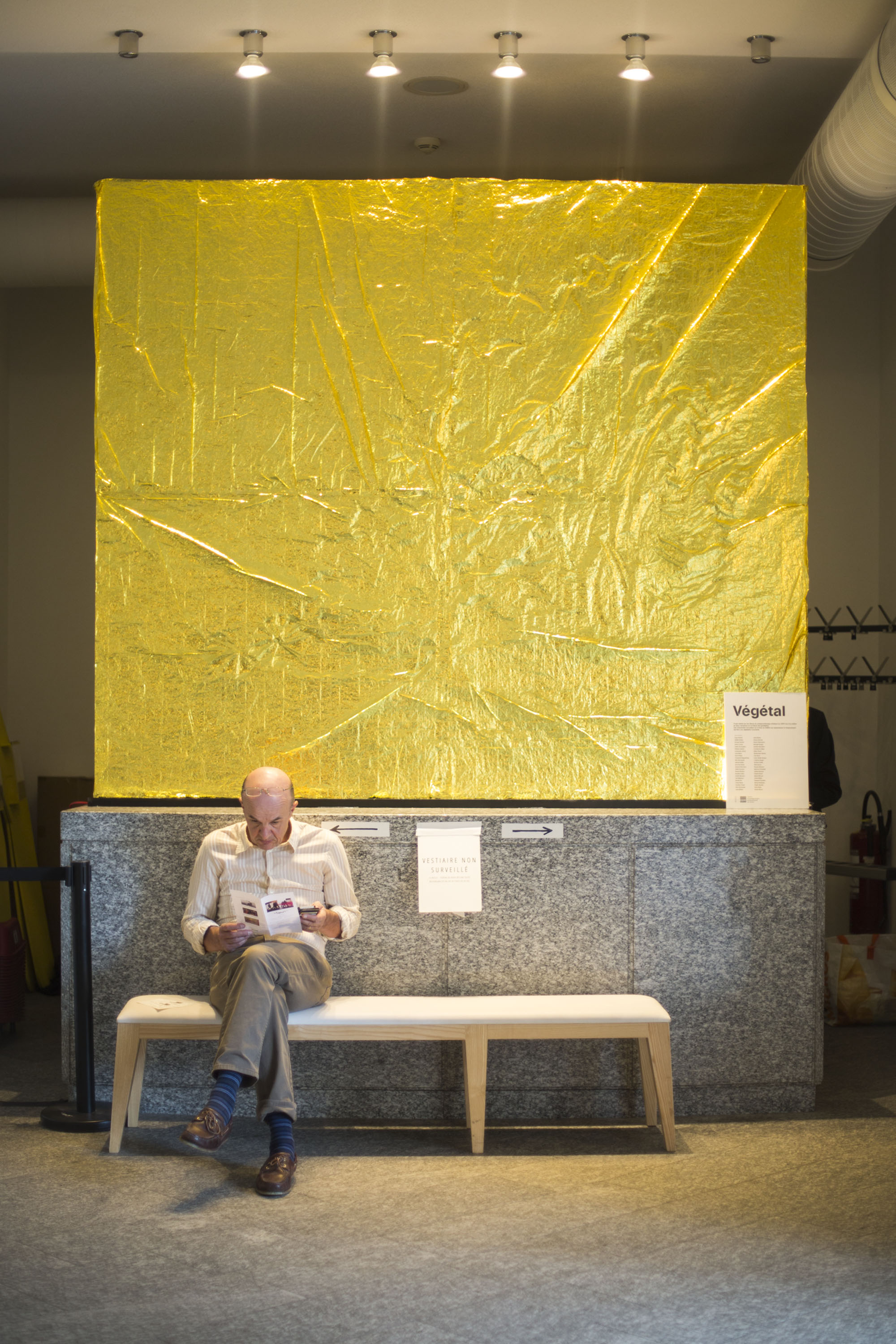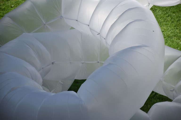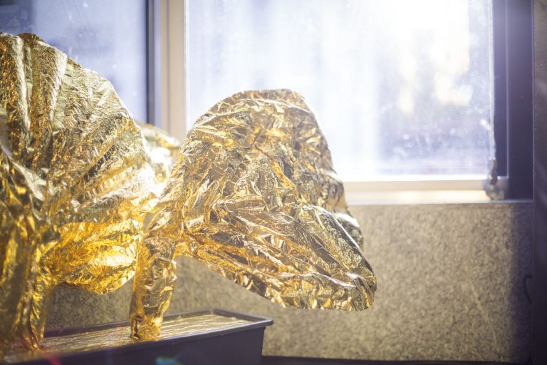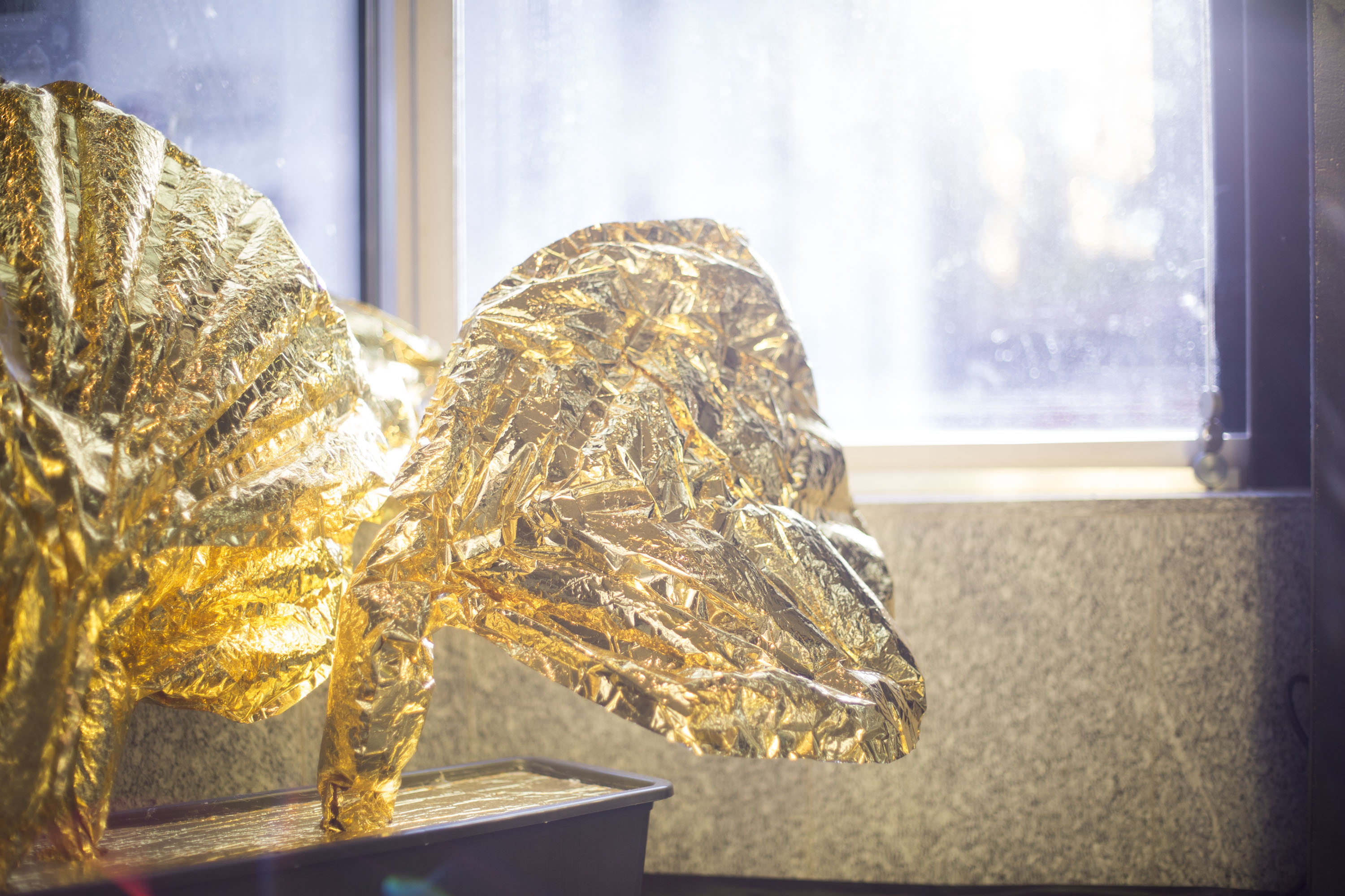 Création du décor pour le Théâtre Le Reflet de Vevey sur le thème végétal et gonflable avec des couvertures de survie dorées.